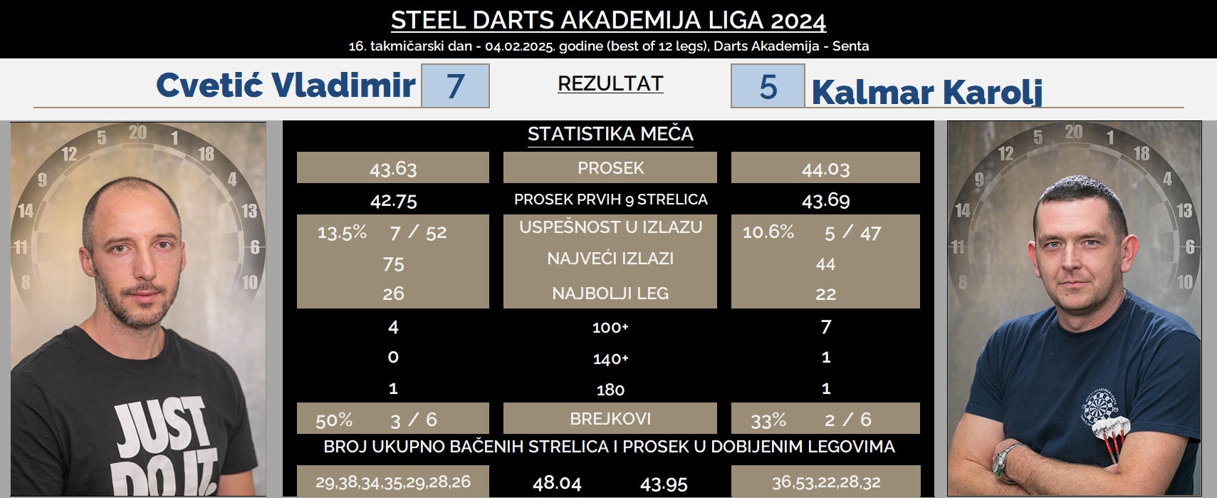 U utorak, 04. februar 2025. godine odigran je 16. takmičarski dan STEEL DARTS AKADEMIJA LIGE 2024/25.